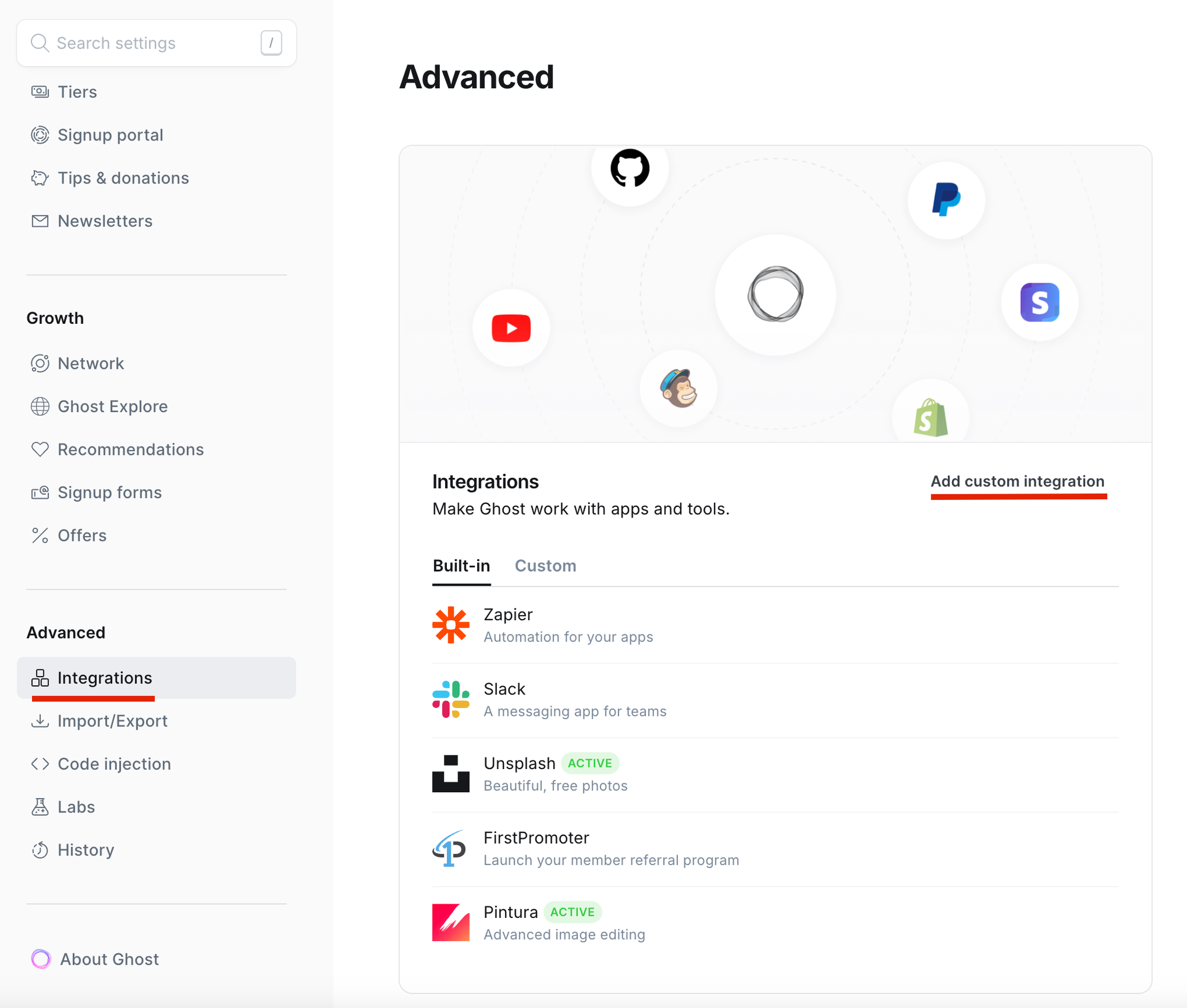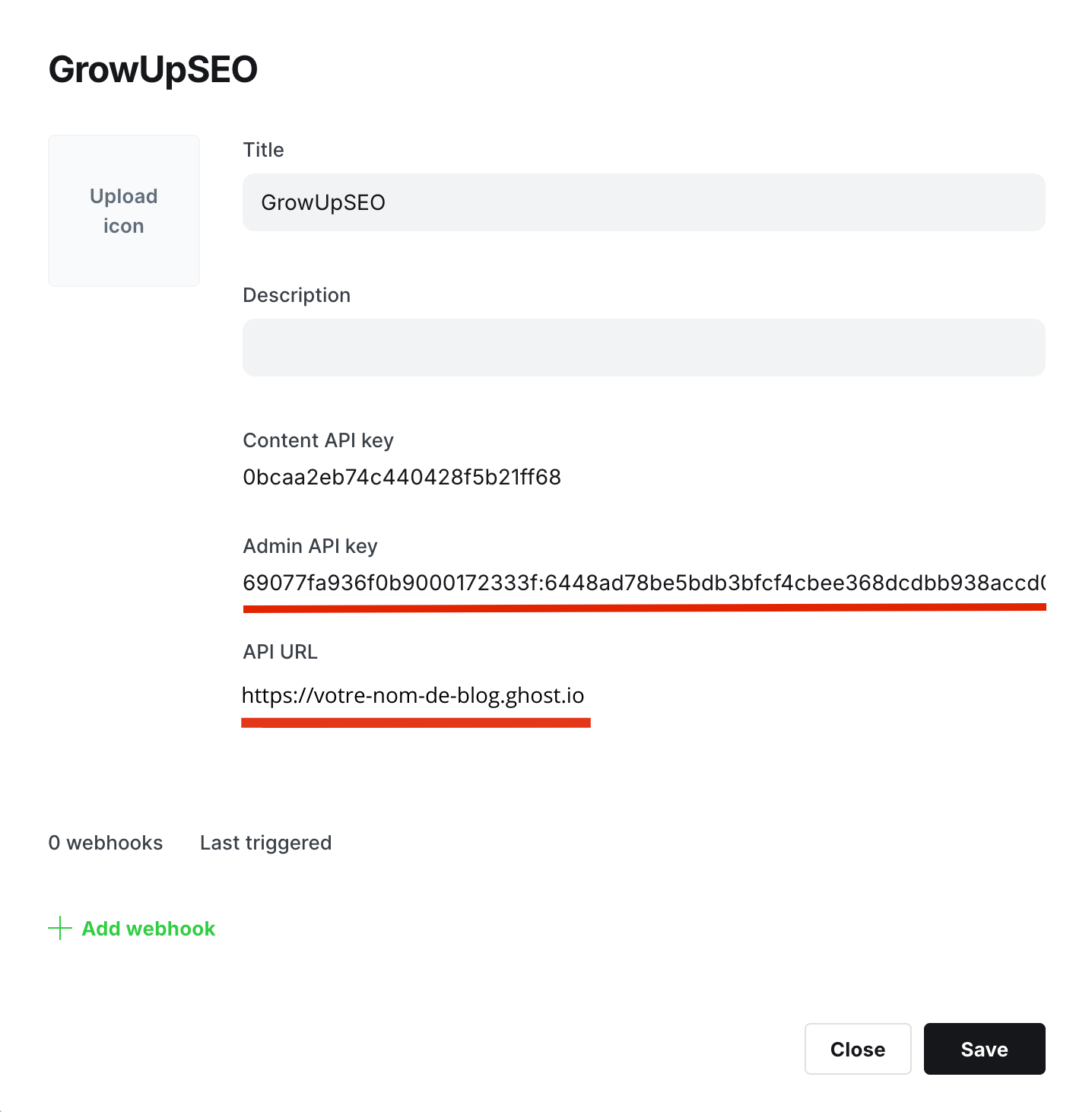 Vous pouvez obtenir cette clé depuis votre tableau de bord Ghost, en allant dans Integrations → Add Custom Integration